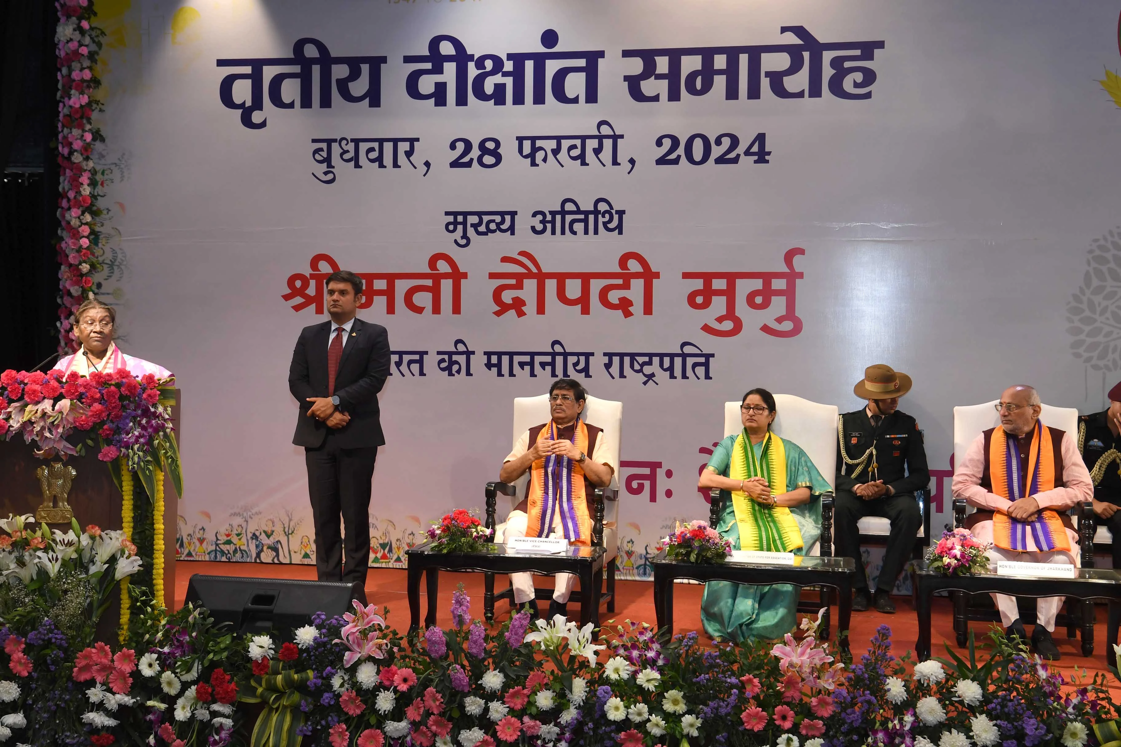 उन्होंने कहा कि हमारे देश में बेटियां और महिलाएं विकास और शिक्षा में सदियों से पीछे रह गई थीं। अब वह आगे आ रही हैं और हर क्षेत्र में शानदार प्रदर्शन कर रही हैं। राष्ट्रपति ने अपने दीक्षांत भाषण में जनजातीय परंपराओं को सहेजने की जरूरत पर जोर देते हुए कहा कि प्रकृति के साथ रहकर जीवन जीने के उनके ज्ञान से अगर हम सीख पाएं तो ग्लोबल वार्मिंग जैसी चुनौती का आसानी से सामना कर सकते हैं।